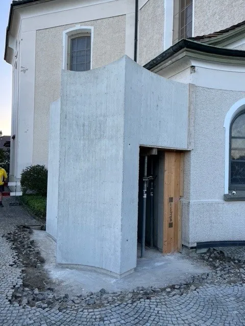 Darum war ein viel genannter Wunsch, dass bei der Sanierung der Pauluskapelle ein barrierefreier Zugang zur Mauritiuskirche realisiert wird. Vergangene Woche wurde nun der Lift-Schacht betoniert. So wird ein Personenlift bald die beidenen Ebenen Kirche und Friedhof verbinden.