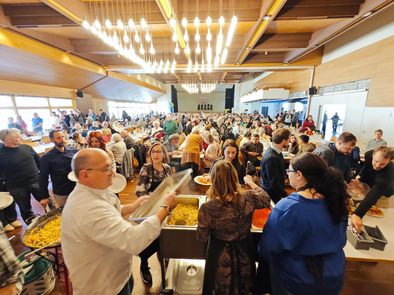Das PASTA-ESSEN, eine stabile Institution in Katholisch Rorschach und ein Anlass, bei dem Kirche sicht- und erlebbar wird. Das zeigte der volle Stadthofsaal am Sonntag, 25. Februar, mit geschätzten 400 Personen. Dahinter steht ein stimmiges Konzept: Die Aura der Cucina Italiana so simpel wie lecker, interkulturelle Liturgie, mitreissender Chor, ergonomische Organisation, omnipräsente Werbung. Die geheimen Stars waren die Köche Heinz Baumgartner und Luigi Lanzarone, welche in stundenlanger Arbeit Pasta mit drei feinen Saucen kreierten. Dazu kommen unzählige Freiwillige. Sie legten Hand an beim Abfüllen, Etikettieren der Sugo-Gläser, Kuchenbacken, Auftischen, Servieren sowie beim Kinderplausch von Jungwacht und Blauring und beim Claro-Laden. Das Tüpfchen auf dem i war wohl der charmante Auftritt der Mädchentanzgruppe «Roundabout» auf der Saalbühne.